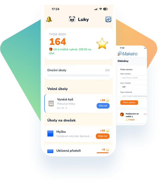 Žádné nálepky ani virtuální hvězdičky. Vy nastavíte, co dítě za body dostane — výlet, pizza, kapesné. Proto to funguje.